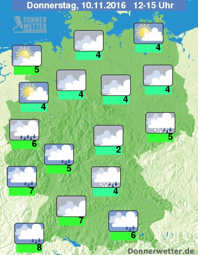 In der Südhälfte des Landes muss auch am Nachmittag mit weiteren Niederschlägen gerechnet werden, während es im Norden meist trocken bleibt. An den Küsten kommt gelegentlich sogar mal die Sonne zum Vorschein. Dazu liegen die Höchstwerte zwischen 2 Grad im Thüringer Bergland und 8 Grad am Oberrhein. Die Schneefallgrenze liegt auf etwa 500 Metern.