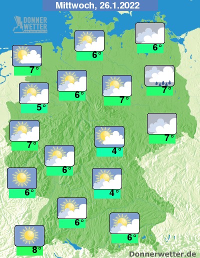 Heute zeigt sich das Wetter oft trüb oder bedeckt, hier und da und vor allem im Süden zeigen sich aber auch Aufheiterungen. Bis auf einige Tropfen über Berlin-Brandenburg bleibt es trocken. Die Temperatur steigt auf 4 Grad in Nürnberg und bis 8 Grad in Freiburg.