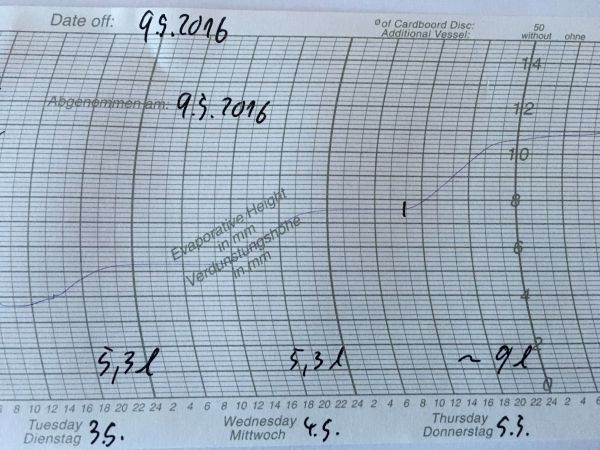Wie unser Schrieb zeigt, verdunsteten alleine zwischen Dienstag und Donnerstag vergangener Woche knapp 20 Liter Wasser pro m². Allein an Vatertag wurden den Böden 9 Liter Flüssigkeit entzogen.