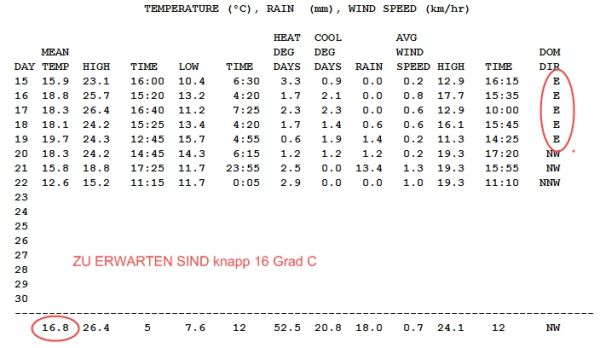 Das Bild zeigt die Temperaturstatistik einer Wetterstation im Flachland mit im Durchschnitt fast 17 Grad C (roter Kreis). Normal wären ca. 15-16 Grad C. Es war also bisher zu warm.