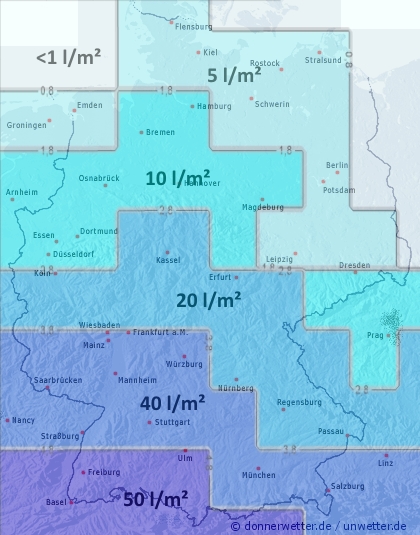 Die nachfolgende Karte zeigt die von uns erwarteten Gesamtniederschlagsmengen zwischen Dienstag und Samstag dieser Woche. Während am Oberrhein bis zum Wochenende bis zu 50 l/m² Regen fällt, geht der äußersten Nordwesten nahezu leer aus.