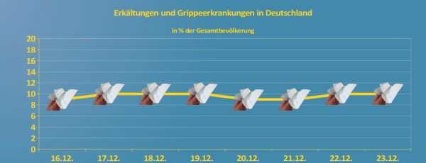 Den milderen Temperaturen in der Vorweihnachtswoche sei Dank, geht es mit den Erkältungs- und Grippezahlen in den nächsten Tagen stetig bergab. Bis Anfang kommenden Woche plagen sich zwischen neun und zehn Prozent der Bewvölkerung mit einem Winterleiden ab - vergleichsweise wenig für diese Jahreszeit.