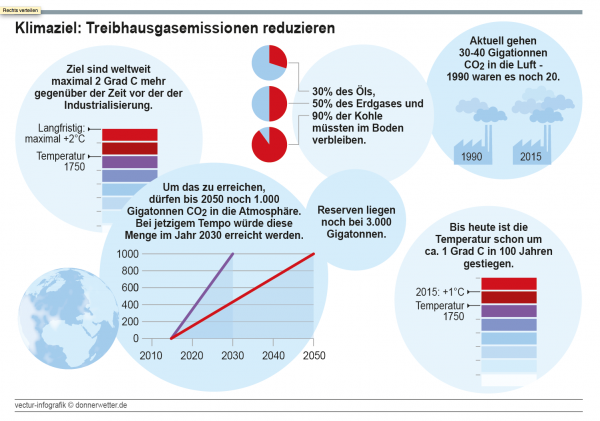 So dürften, möchte man das 2-Grad-Ziel erreichen, bis 2050 noch 1.000 Gigatonnen CO2 in die Atmosphäre gelangen.