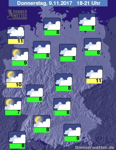 Fast in ganz Deutschland herrschte am Donnerstag (09.11.) dichtes Novembergrau. Örtlich tröpfelte oder nieselte es etwas. Lediglich im Küstenbereich blinzelte gelegentlich mal die Sonne hervor. Die Temperaturen bewegten sich zwischen 6 und 12 Grad C, wobei die höchsten Werte auf den Nordseeinseln erreicht wurden. Ab dem Abend setzte von Nordwesten dann vermehrt Regen ein.
