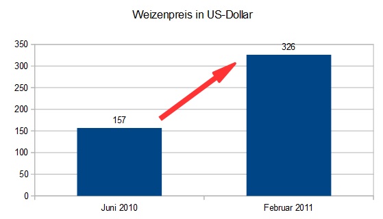 Zusätzlich stiegen die Lebensmittelpreise im Jahr 2010 stark an. Innerhalb weniger Monate (Juni 2010 – Februar 2011) verdoppelte sich der Preis für eine Tonne Weizen von 157 auf 326 Dollar. Anstatt den Menschen in dieser Situation zu helfen, schlug das Assad-Regime die Proteste wegen der steigenden Preise blutig nieder, wodurch der Bürgerkrieg letztlich ausgelöst wurde.