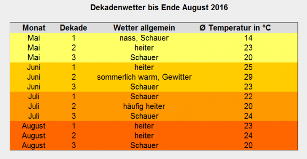 Wer es sommerlich warm mag, der wird sich 2016 vor allem mit dem Juni anfreunden können. Der Juli folgt dann mit sehr durchwachsenen und kühlen Phasen, der August hat zumindest in seinen beiden ersten Dekaden freundliches und warmes Wetter im Gepäck.