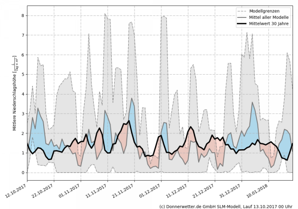Im Osten wird der Niederschlag Ende November stärker zunehmen wohingegen im Süden gleichbleibend wenige Niederschlagsmengen herab kommen.