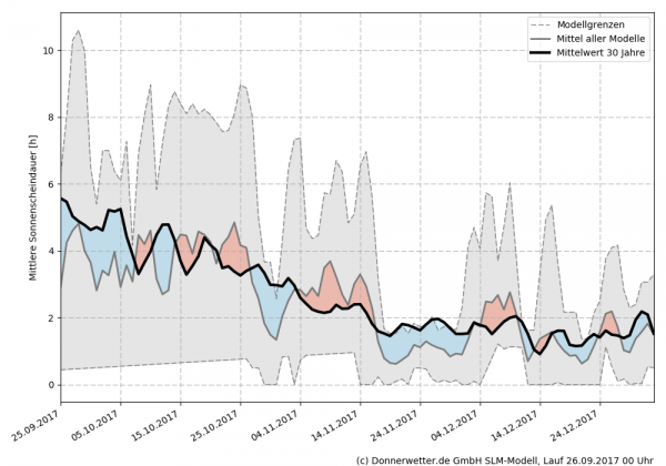 Unsere aktuellen Langfristprognosen für Lufttemperatur, Sonnenscheindauer und Niederschlagshöhe.