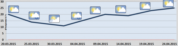 Vor der Monatsmitte bereits sind die wechselhaften Phasen dann aber bereits Geschichte, bei Höchstwerten bis 25 °C  bekommen wir zum Ende des Monats dann sogar schon einen kleinen Vorgeschmack auf den Sommer. Hochdruckwetter überwiegt.