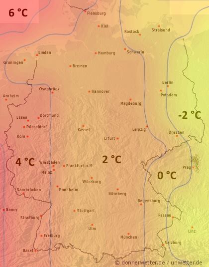 Die Karte zeigt die zu erwartenden, deutschlandweiten Tagestiefsttemperaturen für den Zeitraum 05.01. - 15.01.2017: