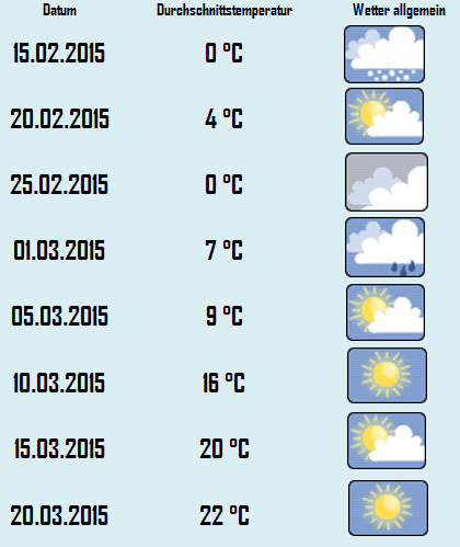 Schon im März könnten dann 20 Grad C und mehr gemessen werden. Mit einer derzeit 70-prozentigen Wahrscheinlichkeit wird der dritte Monat des Jahres 2015 durchschnittlich 2 Grad C zu warm.