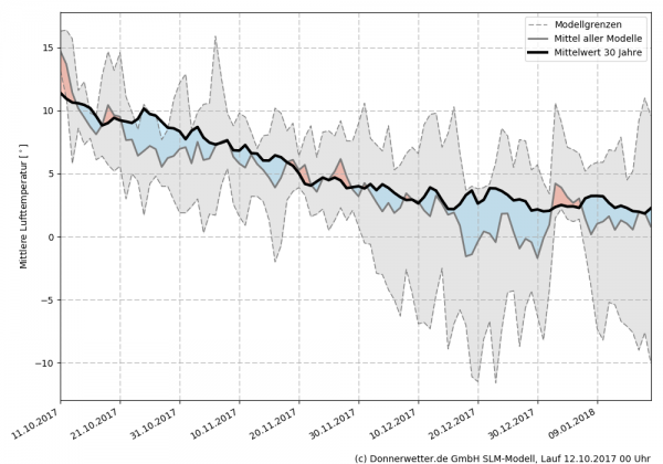 Man wird in den nächsten zwei Wochen in Deutschland merken, dass der Herbst jetzt endgültig angekommen ist. Im Westen, zum Beispiel, sinken die Durchschnittstemperaturen von etwa 15 Grad innerhalb der nächsten zwei Wochen auf 7 Grad ab.