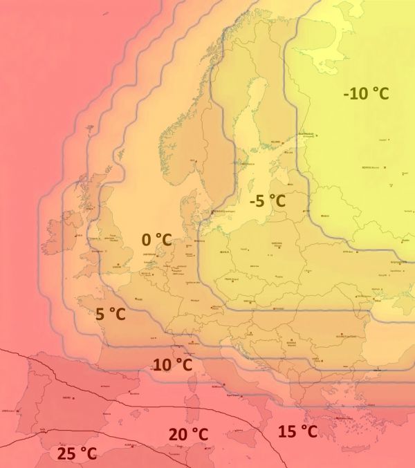 Die folgende Karte zeigt die europaweiten, durchschnittlich zu erwartenden Tagestiefsttemperaturen für den Zeitraum 20. - 25.12.2016.