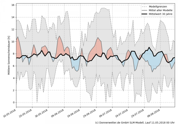 Unsere aktuellen Langfristprognosen für Lufttemperatur, Sonnenscheindauer und Niederschlagshöhe.