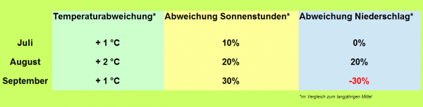 Die Temperatur-, Sonnenstunden- und Niederschlagsabweichungen für Juli bis September!