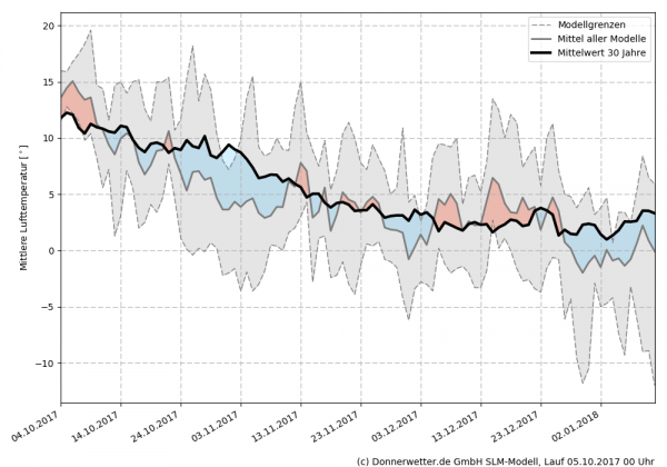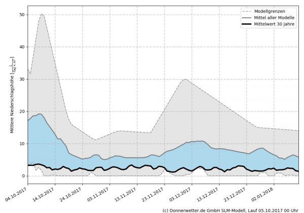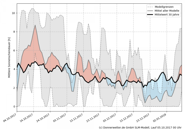 Lässt der Blick auf die ersten beiden Temperatur- und Niederschlagsgrafiken die Hoffnung auf einen goldenen Herbst im Süden in weite Ferne rücken, macht die dritte Grafik dann wieder ein wenig Hoffnung. So berechnet unser Modell momentan vor allem für die letzten beiden Oktoberdekaden sowie die zweite Novemberhälfte viele sonnige Phasen. Da können die eher mäßigen Temperaturen und zeitweilige Schauer auch mal etwas lockerer gesehen werden.