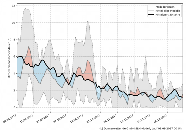 Von den kommenden Tagen einmal abgesehen, droht dem Westen laut aktueller Modelle ab der zweiten Septemberhälfte erst mal eine Temperatur-Durststrecke. Erst Anfang November liegen die mittleren Lufttemperturen wieder dauerhafter über dem 30-Jahres-Mittel. Bei Niederschlag ist der Trend weniger eindeutig, mal liegen die Werte über, mal unter dem Durchschnitt. Für die Sonnenstunden sieht es in diesem Herbst dagegen wieder eher schlecht aus...