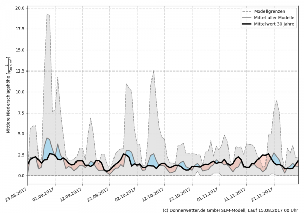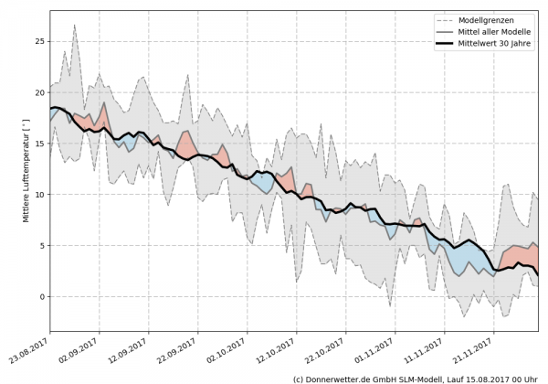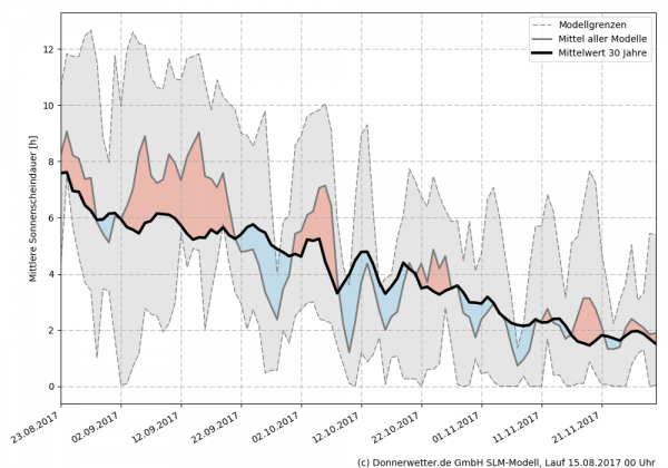 Unsere aktuellen Modellläufe prognostizieren dem Osten Deutschlands für die anstehenden Wochen überwiegend "durchschnittliches Wetter" - zumindest in Hinblick auf die zu erwartenden Lufttemperaturen und die Niederschlagssummen. Etwas heraus sticht zur Zeit die Prognosegrafik der vorhersagten Sonnenstunden: Besonders die die zweite Augusthälfte sowie die ersten drei Septemberwochen haben nach derzeitigem Stand viel Sonnenschein im Gepäck.