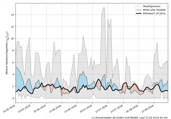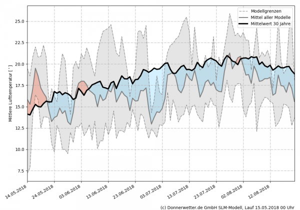 Nach einem eher zu milden Temperaturabschnitt bewegen sie die Temperaturen in der letzten Monatsdekade wieder unter dem Soll. Auch die aktuell von unserem Modell für den Westen berechneten Niederschläge und Sonnenstunden rücken die zweite Maihälfte nur bedingt in gutes Licht.