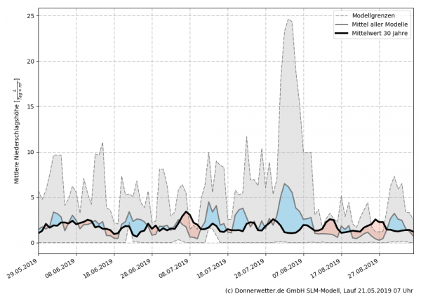 Während die Prognosen der zu erwartenden Niederschlagssummen für die nächsten Wochen im Westen keinem eindeutigen Trend folgen, berechnen die Modelle bei den Temperaturen für diese Jahreszeit zu niedrige Werte. Die Sonne zeigt sich über weite Strecken seltener als üblich.
