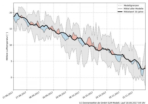 Große Temperatursprünge sind nach den aktuellen Berechnung unserer Langfristpronosen für die nächsten Wochen nicht zu erwarten: Mal liegen die zu erwartenden Mitteltemperaturen schwach über, mal schwach unter dem langjährigen Mittel. Ebenfalls ungefähr die Waage hält sich die Sonnenscheindauer über den auf den Grafiken ersichtlichen Zeitraum. Bei den Niederschlagssummen zeichnet sich ein schwach negativer Trend ab.