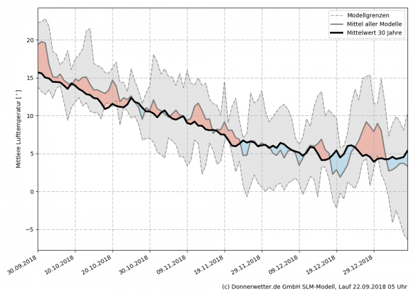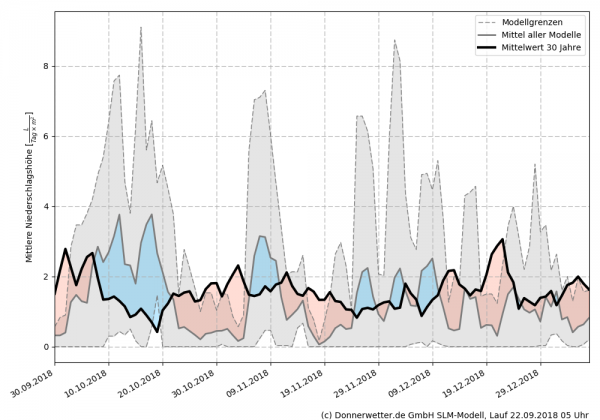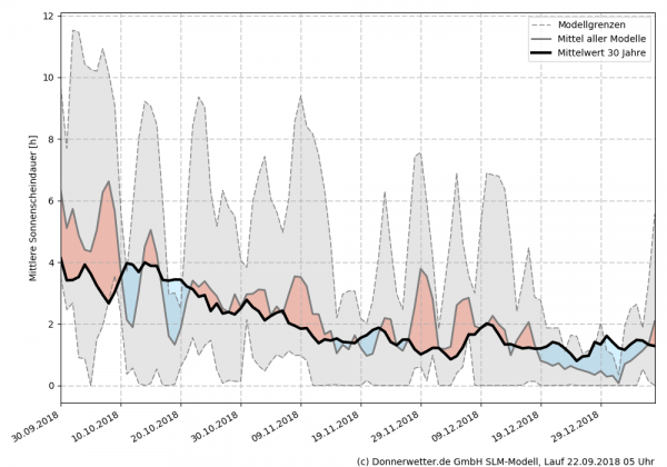 Unsere aktuellen Langfristmodelle für den Westen Deustchlands, zeigen fast identische Werte wie für den Norden. meist überdurchschnittliche Werte bis in den Dezember hinein mit vielen Sonnenstunden. Doch Mitte Oktober zeigt uns die Regengrafik einen verregneten Abschnitt mit starker Tendenz.