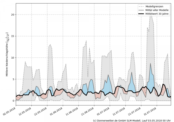 Unsere aktuellen Langfristmodelle berechnen den Mai für den Osten des Landes aktuell als durchwachsen. Die mittleren Lufttemperaturen liegen bis auf wenige Ausnahmen unter dem langjährigen Mittel. Bis auf eine längere sonnige Phase in der ersten Dekade ist es zudem zu sonnenarm. Bei den Niederschlagssummen gibt es dagegen zur Zeit noch keinen eindeutigen Trend.