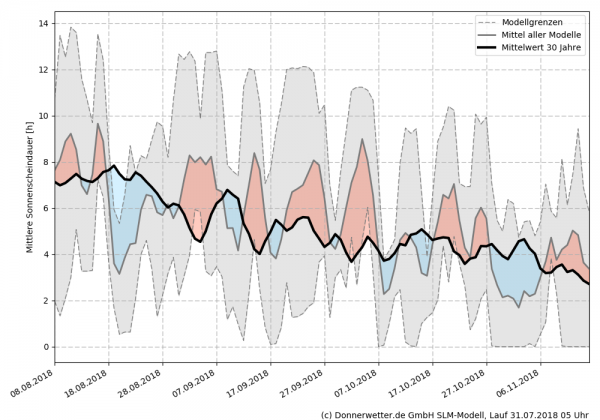 Ein Blick auf die Temperaturprognose der kommenden Wochen zeigt: Es bleibt auch weiterhin überdurchschnittlich warm. Zu trockene und zu nasse Phasen halten sich im Süden bis Ende September dabei meist die Waage. Ausgenommen die dritte Augustdekade ist zudem mit mehr Sonnenstunden als üblich zu rechnen.