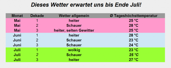 Wie die Langfristmodelle den Zeitraum zwischen Anfang Mai und Ende Juli aktuell berechnen, sehen Sie hier: