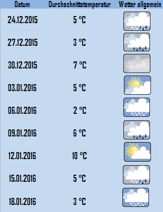 Entgegen unserer Prognose zeigt sich ab der Monatsmitte bis zum jetzigen Zeitpunkt kein Kälterückfall; und auch eine Kälteperiode über Weihnachten ist zur Zeit eher unwahrscheinlich. An nur ein bis zwei Tagen sinkt in diesem Monat die Temperatur im Flachland auf Werte um 0 - 5 Grad.