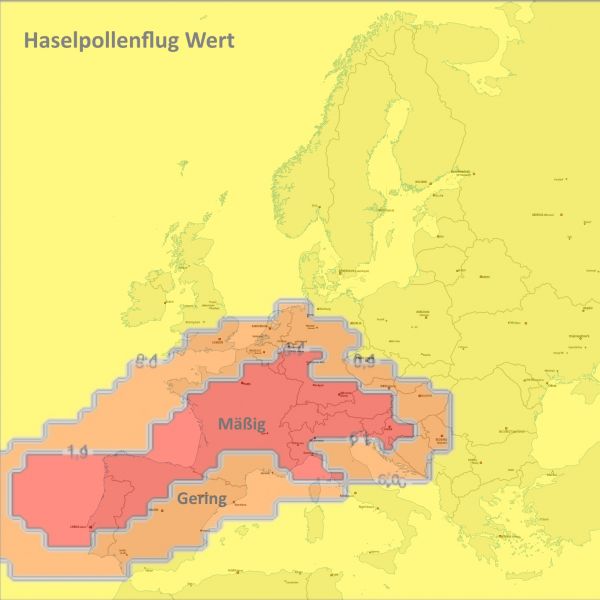Mit südwestlichen Winden können bis Donnerstagabend einzelne Haselpollen zu uns nach Deutschland gelangen. Ab Freitag ändert sich die Wetterlage, kühlere und feuchte Luft ist ab dann wetterbestimmend.