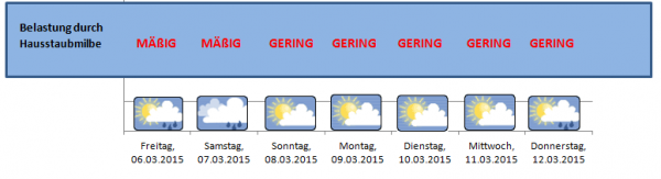 Am Wochenende sind die Belastungen durch die hohe Luftfeuchtigkeit recht hoch. Mit der neuen Woche sinkt die Luftfeuchtigkeit ab und es treten nur noch geringe allergische Bealstungen durch Hausstaub auf.