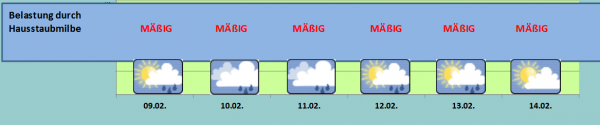 Die erhöhte Luftfeuchtigkeit sorgt in den kommenden Tagen beim Hausstaub für insgesamt mäßige Belastungen. Besonders Hausstauballergiker sollten die trockenen Wetterabschnitte nutzen, um die vier Wände gut durchzulüften.