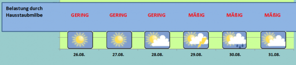 Erst zu Beginn der neuen Woche erhöht sich mit dem Durchzug einer Kaltfront das Hausstaubrisiko, die Luftfeuchtigkeit steigt vor allem in der ersten Wochenhälfte an.