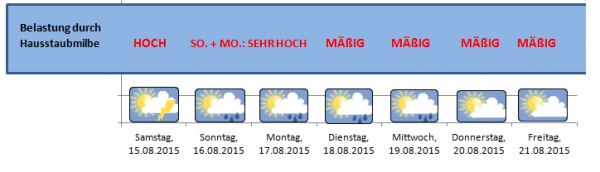 Ab Mitte kommender Woche entspannt sich die Lage vorerst wieder. Durch den Einfluss trockener Luftmassen sinkt die Luftfeuchtigkeit und somit die Milbenbelastung in den Innenräumen.