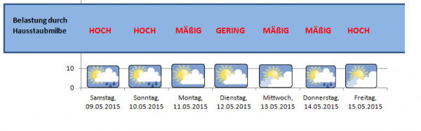 Der Kot der Hausstaubmilben wird daher am Wochenende für viele Probleme sorgen. Erst die Wetterbesserung und der Einfluss trockener Luft im Laufe der nächsten Woche wird das Allergiepotential mindern.