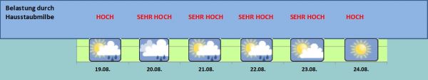 Ab dem Wochenende steigt die Luftfeuchtigkeit mit einer erhöhten Schauer- und Regenwahrscheinlichkeit deutlich an. Auch der Dampfdruck steigt erheblich. Dadurch findet die Milbe bis Mitte kommender Woche beinahe ideale Bedingungen vor. Anschließend sorgt niederschlagsärmeres Wetter für eine leichte Entlastung.