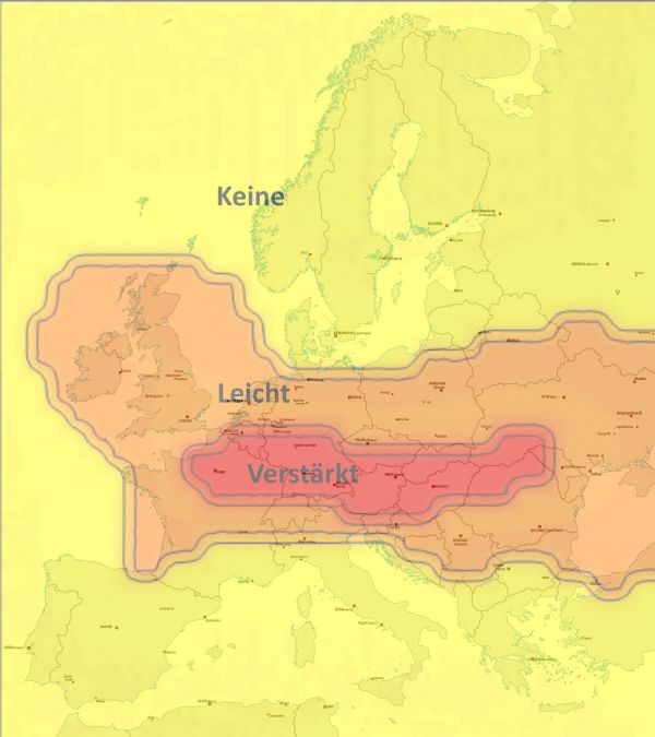 Unsere Grafik zeigt den zu erwartenden, deutschlandweiten Brennnesselpollenflug in der ersten Hälfte der neuen Woche.
