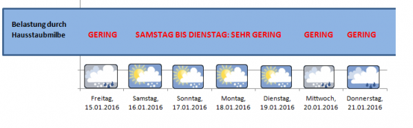 Für Milben ein schädliches Klima, sie sterben in den kommenden Tagen massenhaft. Die Belastungen für Hausstauballergiker sind, sofern die Heizungsluft die Milbenüberreste nicht zirkulieren lässt, in dieser Woche überwiegend als schwach einzustufen.