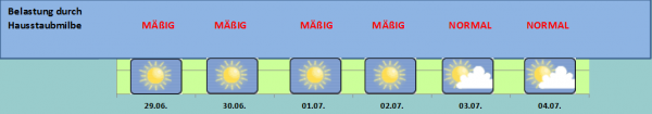 Die Außenluftfeuchtigkeit ist sehr gering  und somit sinkt auch die Belastungen durch Hausstaub. Das wird wohl vielen Allergikern zu gute kommen, denn das setzt sich auch in der neuen Woche fort. Strahlende Sonne mit sehr warmen Temperaturen.