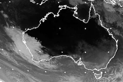 Auf dem Satellitenbild von Donnerstag früh sind nur im Westen und im äußersten Südosten des Kontinents dichtere Wolken zu erkennen, sonst bleibt der Himmel über Australien meist wolkenfrei. Die Wolken im Westen sorgen heute für etwas Regen, sonst bleibt es meist trocken. (Bildquelle: NERC Satellite Receiving Station, Dundee University, Scotland, http://www.sat.dundee.ac.uk/)