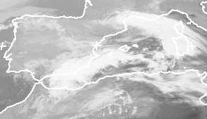 Die dichten Wolken gehören zu einem Tiefdrucksystem, das sich von den kanarischen Inseln bis zu den Balearen erstreckt. Dieses Tiefdrucksystem sorgt heute auf der iberischen Halbinsel, sowie auf den Balearen und an der Nordafrikanischen Küste für teils kräftige Schauer oder Gewitter. (Bildquelle: NERC Satellite Receiving Station, Dundee University, Scotland, http://www.sat.dundee.ac.uk/)