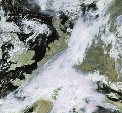 Auf dem Satellitenbild vom Mittwochmittag erkennt man dichte Bewölkung, die sich von Frankreich in einem breiten Band nordostwärts über Deutschland erstreckt. In diesem Bereich liegt eine Luftmassengrenze zwischen kühlerer Luft im Nordwesten und wärmerer im Südosten. Sie verlagert sich kaum. Weiter nach Südosten und Nordwesten findet man nur einzelne lockere Wolken. Ein sehr kleiner Tiefdruckwirbel liegt zudem über der Nordsee.