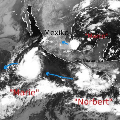 Drei Wirbelstürme zeigt das Satellitenbild von heute Mittag rund um Mexiko. 'Marco' liegt dabei an der Ostküste am Golf von Mexiko und erreicht Windgeschwindigkeiten von etwa 100 km/h. 'Marie' liegt südwestlich vor der Küste und Pazifik und ist mit Windgeschwindigkeiten von etwa 50 km/h schon recht schwach. 'Norbert' dagegen hat mit Windmitteln von 120 km/h Hurrikanstärke. Während 'Marco' und 'Marie' sich weiter abschwächen, verstärkt sich 'Norbert' noch. Er wandert nun zunächst an der Südküste von Mexiko in westliche Richtung weiter und könnte Berechnungen zufolge im weiteren Verlauf auf Niederkalifornien zuziehen.(Bildquelle: Copyrigt EUMETSAT, NERC Satellite Receiving Station, University of Dundee)