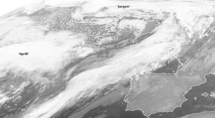 Heute ziehen die Wolken des Sturmtiefs 'Jürgen' über Deutschland hinweg, sodass vor allem am Abend im Nordwesten mit schweren Sturmböen gerechnet werden muss. Für morgen steht schon das Orkantief 'Kyrill' bereit, das ganz Deutschland Orkanböen bringen wird.
