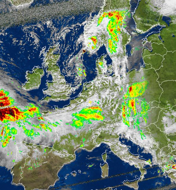 Die Satellitenbildaufnahme von heute Nachmittag zeigt verbreitet viele und oft dichte Wolken über weiten Teilen von Europa. Die Ausläufer eines kräftigen Tiefs westlich der Biskaya sorgen über Ostfrankreich und auch schon im Südwesten Deutschlands für teils kräftige und langanhaltende Niederschläge. Ein weiteres Tief liegt über der Nordsee und bringt mit seinen Ausläufern dichte Regenwolken ins südliche Skandinavien.