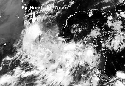 Ex-Hurrikan 'Dean' liegt heute über dem Golf von Kalifornien. Er hat sich zwar stark abgeschwächt, sorgt aber weiterhin für intensive Regenfälle vor allem an der mexikanischen Pazifikküste. Das Tief bewegt sich langsam nach Nordwesten und löst sich dabei auf.(Bildquelle: NERC Satellite Receiving Station, Dundee University, Scotland, http://www.sat.dundee.ac.uk/)