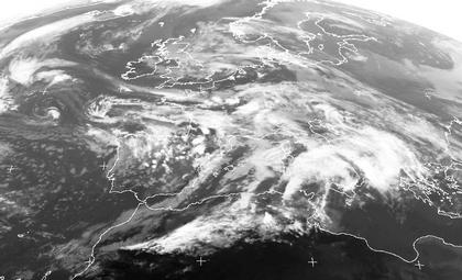 Das Satellitenbild zeigt den Einfluß feuchtmilder Meeresluft in weiten Teilen Europas, es bilden sich verbreitet Wolken und Schauer. Im Nordosten ist ein Hochdruckgebiet wetterwirksam, zusammen mit einem Tief über Rußland bringt es vor allem im Osten Schnee und Temperaturen nur knapp über 0 Grad.