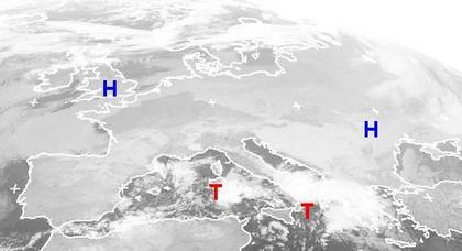 Im Mittelmeer bringen zwei Tiefdruckgebiete örtlich Schauer oder Gewitter, vor allem über Süditalien und Griechenland. Sonst sorgt Hochdruckeinfluss in weiten Teilen Europas für teils freundliches, teils aber auch trübes Wetter. Vor allen über Norddeutschland liegt eine dichte Hochnebeldecke. (Bildquelle: NERC Satellite Receiving Station, Dundee University, Scotland, http://www.sat.dundee.ac.uk/)