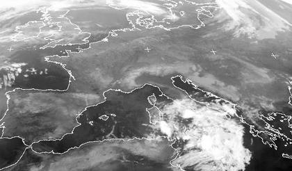 Über Süditalien und dem Mittelmeer sorgt ein Tief für Schauer, in seinen Wolken sind auch einzelne Gewitterzellen zu erkennen. Sonst ist Europa unter einer Hochzone fast wolkenfrei.